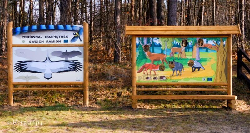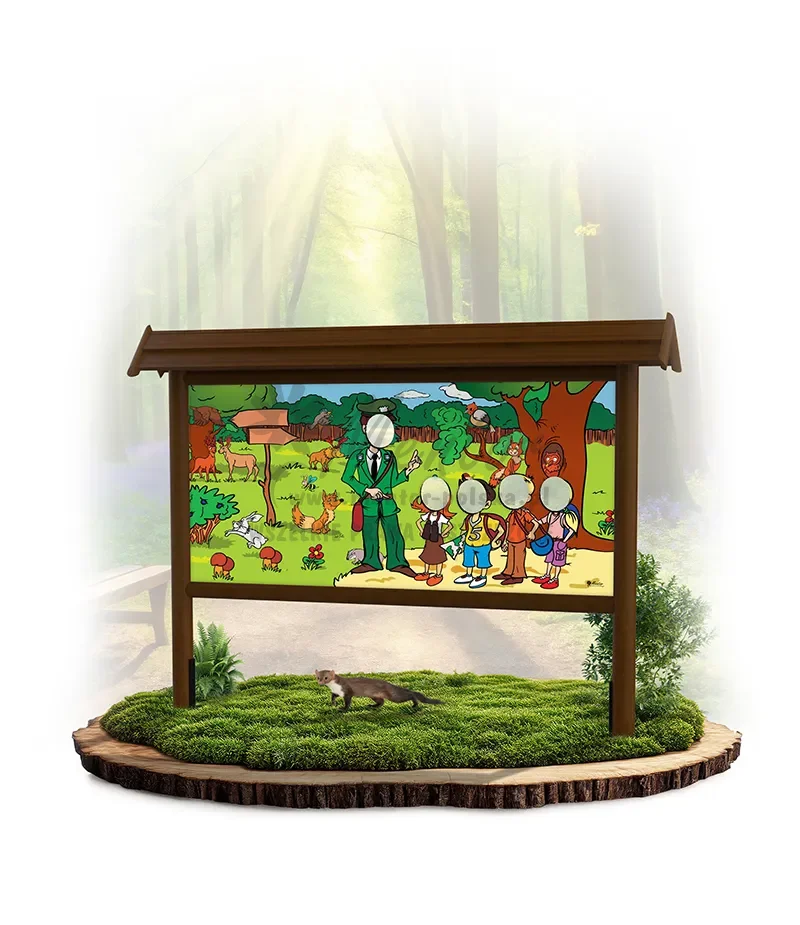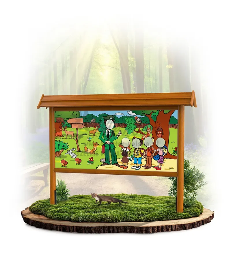 Jest to kolorowa tablica z otworami (do włożenia głowy) umieszczona w drewnianej, masywnej konstrukcji zamocowanej do podłoża przy pomocy kotew stalowych z daszkiem dwuspadowym oraz opcjonalnie do wyboru z ławką umożliwiającą odpoczynek. Cała konstrukcja wymiarów około 300 cm szer. x 220 cm wys. a słupy nośne około 12-14 cm średnicy.