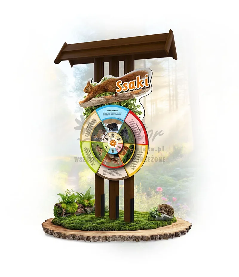 Konstrukcja o wymiarach zewnętrznych około 135x220x40 cm, wykonana z drewna iglastego, oparta na trzech słupach nośnych, średnicy około 12-14 cm. Całość zwieńczona dwuspadowym dachem. W konstrukcji zamocowano wycięty po konturze panel edukacyjny o szerokości około 90 cm. Do panelu zamontowano obrotowy, okrągły panel (koło) o średnicy około 60 cm, na którym znajduje się kolejny okrągły panel edukacyjny o średnicy około 25 cm. Dla bezpieczeństwa użytkowników wszystkie koła obrotowe posiadają obłe krawędzie.