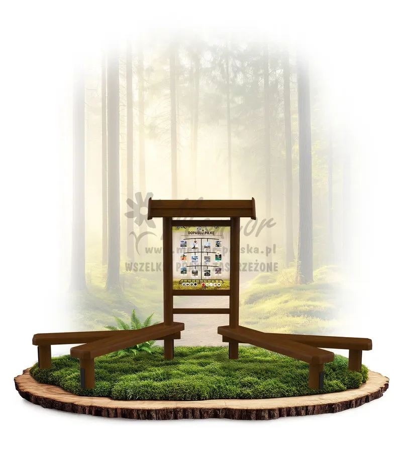 Konstrukcja o wymiarach zewnętrznych: szerokość około 275-475 cm (w zależności od ustawienia ławek), wysokość około 220 cm i głębokość około 100-200 cm, wykonana z drewna iglastego, oparta na słupach nośnych średnicy około 12-14 cm, w których zamontowano na wpust poprzeczki. Do każdego ze słupów są przymocowane po 2 ławki (łącznie 4 szt.) rozłożone wachlarzowato (jak na wizualizacji). Całość zwieńczona dwuspadowym dachem. W konstrukcji zamocowano dwustronnie zadrukowany panel edukacyjny. Na awersie panelu zamontowano od 3 do 12 monolitycznych kółek (w zależności od tematu). Są one umieszczone w prowadnicach tworzących tzw. „labirynt”, w którym można je dopasować do nadrukowanych zdjęć lub grafik. Na rewersie panelu umieszczono tablicę edukacyjną nawiązującą tematycznie do awersu gry (labirynt).