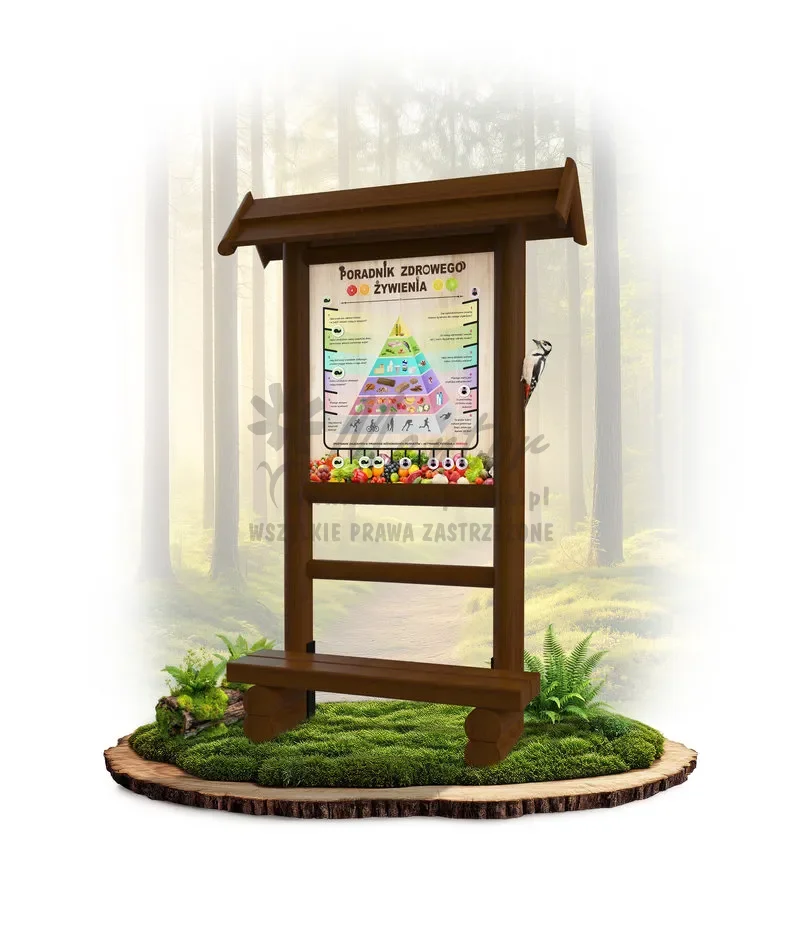 Konstrukcja o wymiarach zewnętrznych około 135 x 220 x 40 cm, wykonana z drewna iglastego, oparta na słupach nośnych średnicy około 12-14 cm, w których zamontowano na wpust poprzeczki. Całość zwieńczona dwuspadowym dachem. W konstrukcji zamocowano dwustronnie zadrukowany panel edukacyjny. Na awersie panelu zamontowano od 3 do 12 monolitycznych kółek (w zależności od tematu). Są one umieszczone w prowadnicach tworzących tzw. „labirynt”, w którym można je dopasować do nadrukowanych zdjęć lub grafik. Na rewersie panelu umieszczono tablicę edukacyjną nawiązującą tematycznie do awersu gry (labirynt).