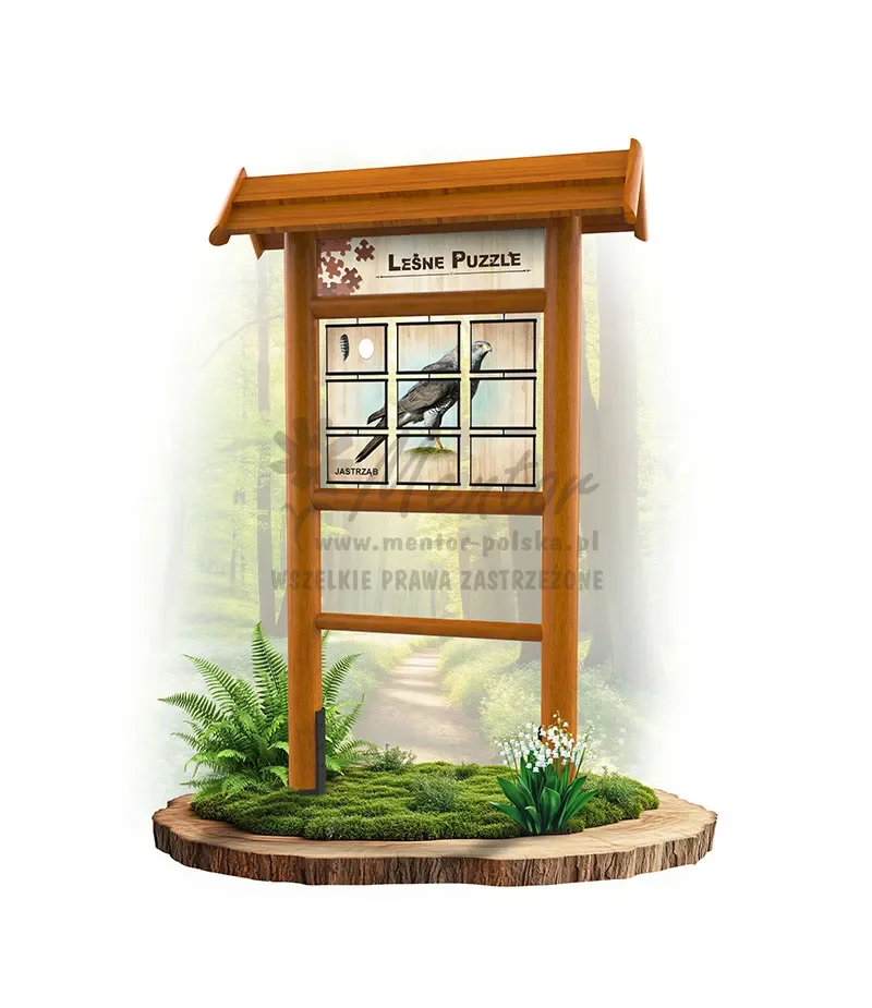 Konstrukcja o wymiarach zewnętrznych około 135x220x40 cm, wykonana z drewna iglastego, oparta na słupach nośnych średnicy około 12-14 cm, w których zamontowano na wpust poprzeczki. Całość zwieńczona dwuspadowym dachem. W konstrukcji zamocowano panel tytułowy oraz 9 obracanych tablic edukacyjnych, o wymiarach około 22x17x2 cm, umocowanych na 3 prętach ze stali nierdzewnej. Dla bezpieczeństwa użytkowników tablice posiadają obłe krawędzie, wykonane z malowanego proszkowo profilu aluminiowego.