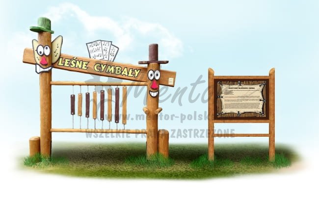 Konstrukcja o wysokości ok. 230 cm, długości ok. 300 - 350 cm (w tym tablica w stelażu SD11) oparta na dwóch masywnych słupach nośnych. W konstrukcji jest zamocowana deska o wymiarach około 210 cm x 30 cm. Leśne cymbały zawierają 8 wiszących pionowo drewnianych desek, o długości od 40 cm do 80 cm zamontowanych na prowadnicach ze stali nierdzewnej. Dodatkowo dołączony jest drążek - "pałka" służący do uderzania w drewniane deski.