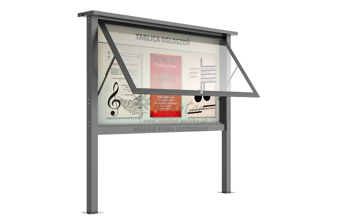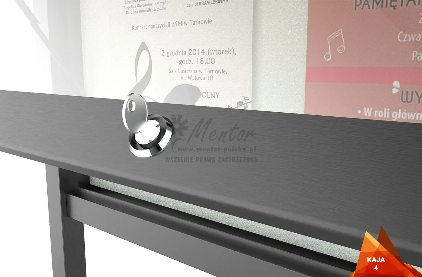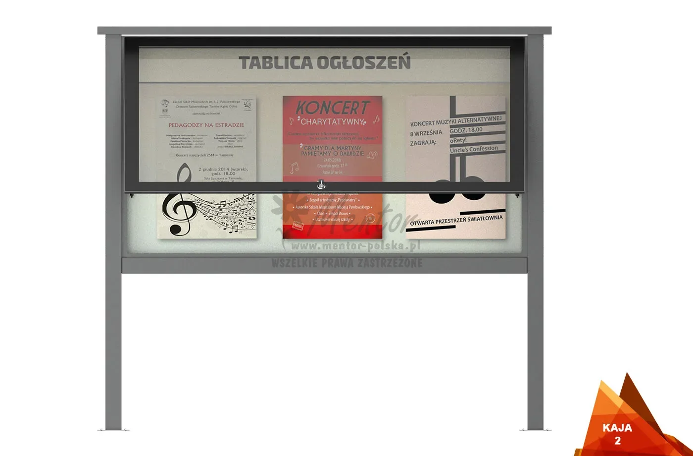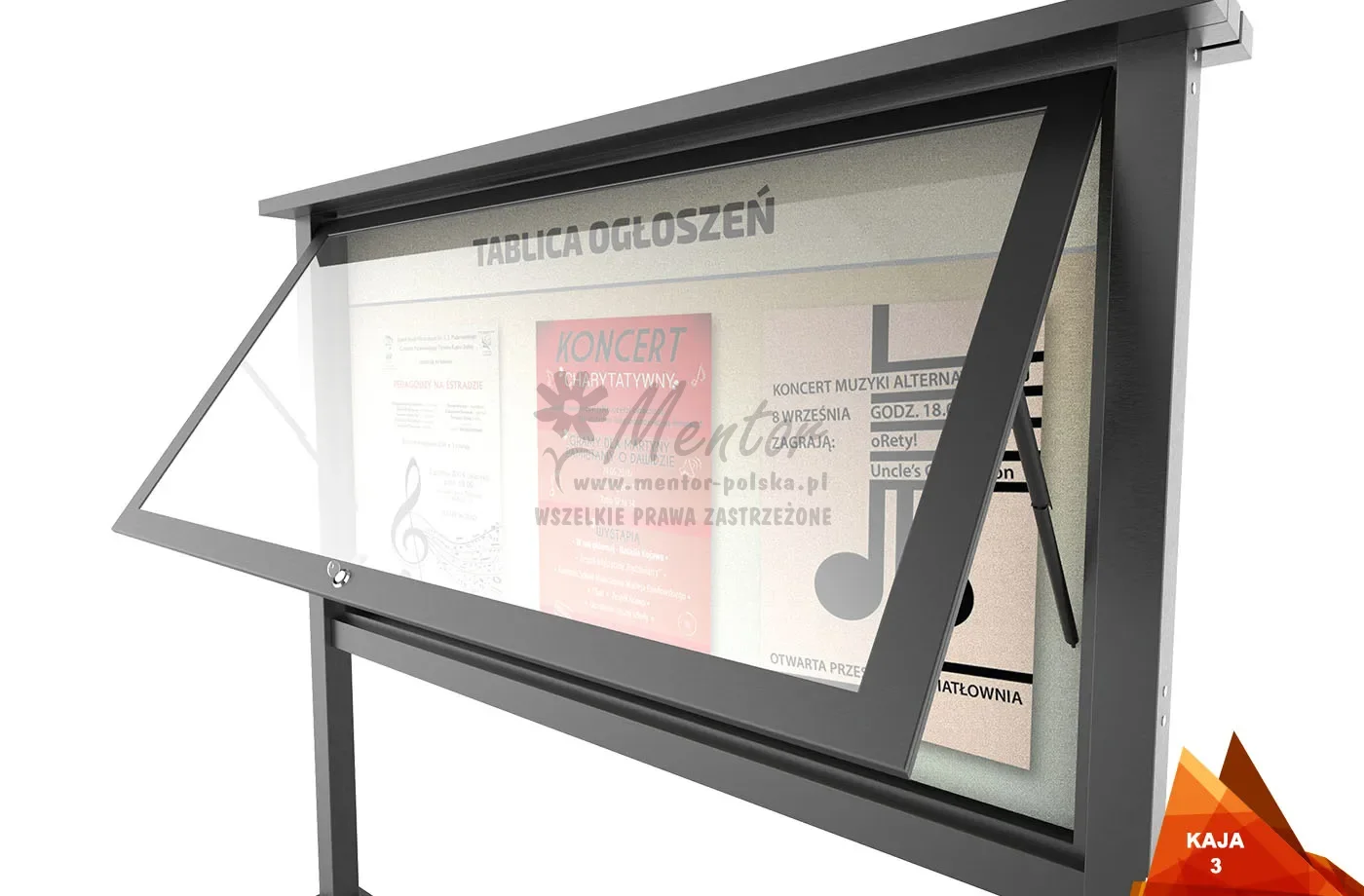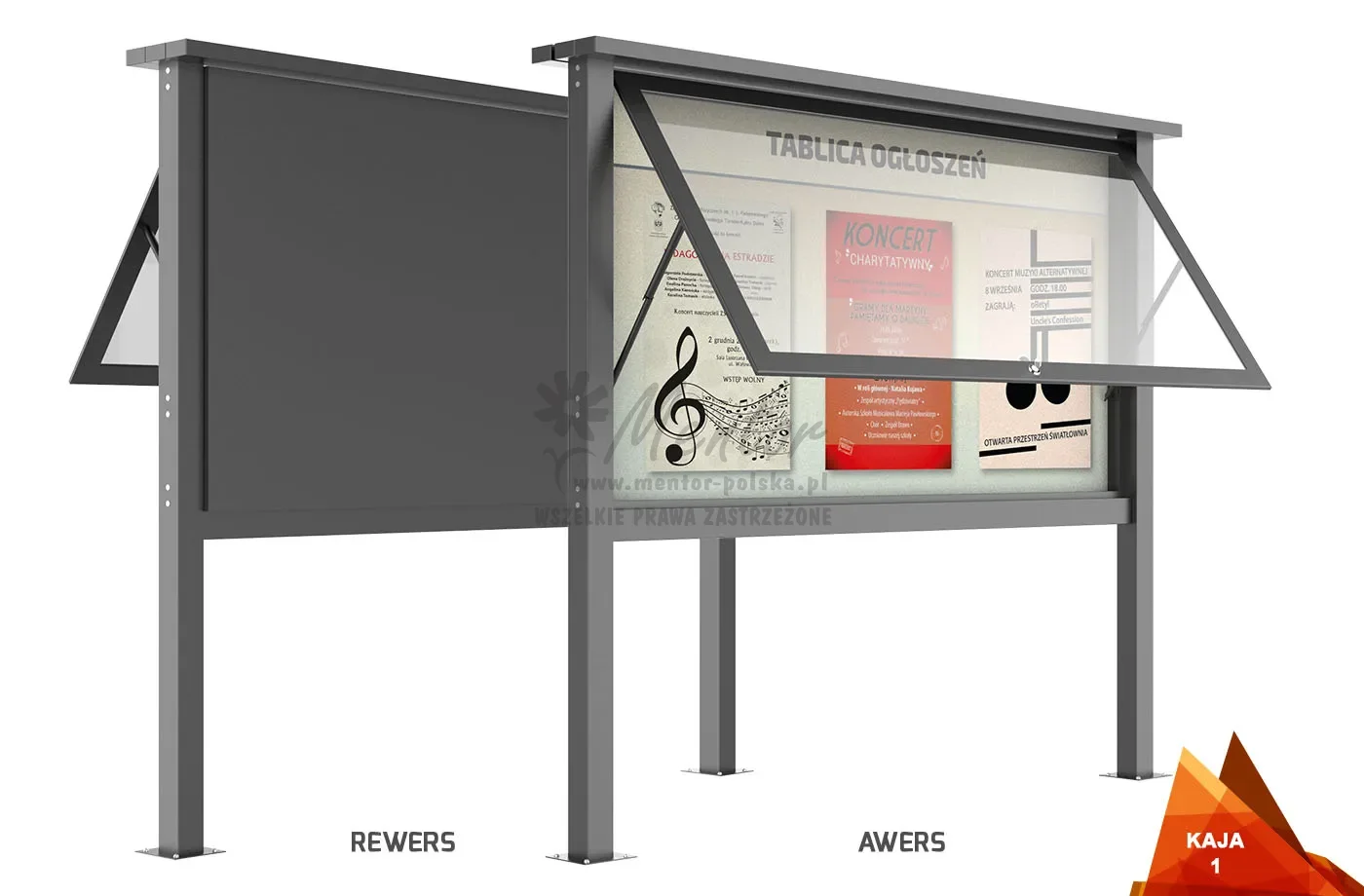 KAJA to informacyjna gablota terenowa z uchylną ramą ze szkłem hartowanym oraz zamkiem zabezpieczającym. Produkt sprawdzi się jako tablica informacyjna i ogłoszeniowa w miastach i parkach, wpasowując się przy tym idealnie do nowoczesnego otoczenia.