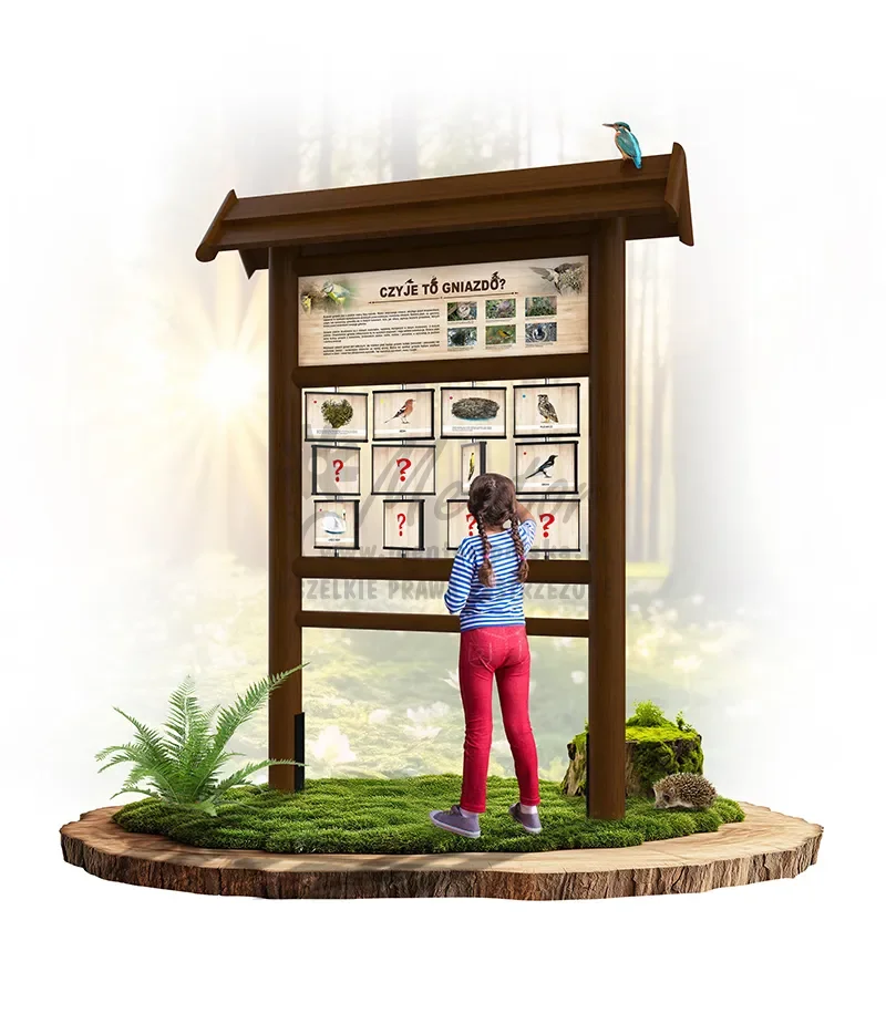 Konstrukcja o wymiarach zewnętrznych około 160x220x40 cm, wykonana z drewna iglastego, oparta na słupach nośnych średnicy około 12-14 cm, w których zamontowano na wpust poprzeczki. Całość zwieńczona dwuspadowym dachem. W konstrukcji zamocowano panel tytułowy oraz 12 obracanych tablic edukacyjnych, o wymiarach około 22x17x2 cm, umocowanych na 4 prętach ze stali nierdzewnej. Dla bezpieczeństwa użytkowników tablice posiadają obłe krawędzie, wykonane z malowanego proszkowo profilu aluminiowego.
