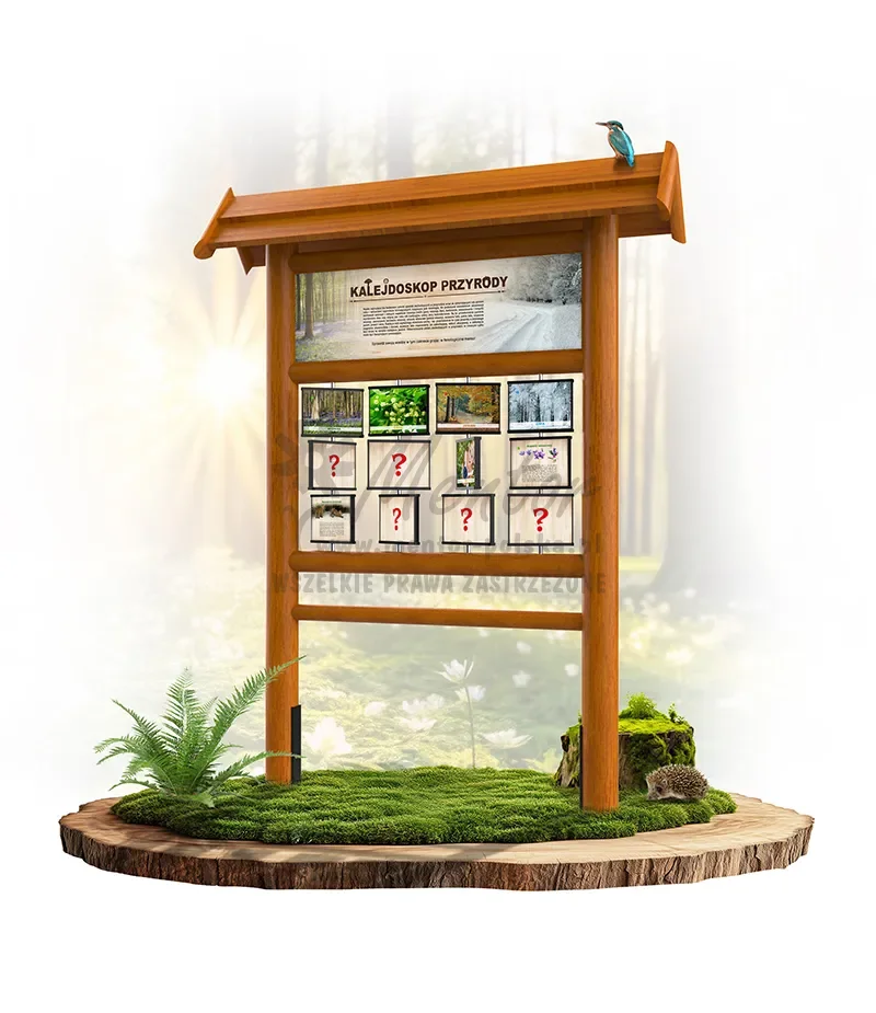 Konstrukcja o wymiarach zewnętrznych około 160x220x40 cm, wykonana z drewna iglastego, oparta na słupach nośnych średnicy około 12-14 cm, w których zamontowano na wpust poprzeczki. Całość zwieńczona dwuspadowym dachem. W konstrukcji zamocowano panel tytułowy oraz 12 obracanych tablic edukacyjnych, o wymiarach około 22x17x2 cm, umocowanych na 4 prętach ze stali nierdzewnej. Dla bezpieczeństwa użytkowników tablice posiadają obłe krawędzie, wykonane z malowanego proszkowo profilu aluminiowego.