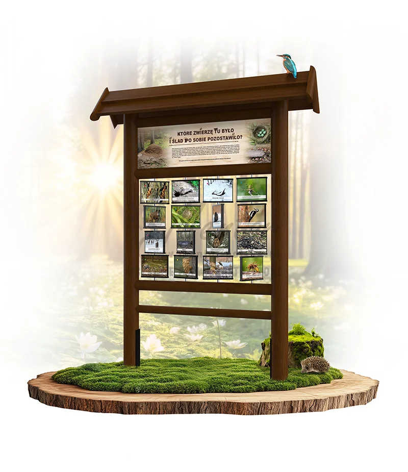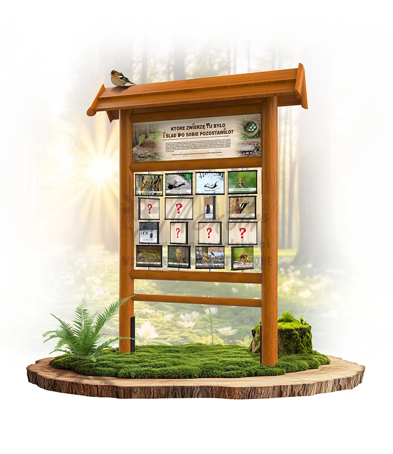 Konstrukcja o wymiarach zewnętrznych około 160x220x40 cm, wykonana z drewna iglastego, oparta na słupach nośnych średnicy około 12-14 cm, w których zamontowano na wpust poprzeczki. Całość zwieńczona dwuspadowym dachem. W konstrukcji zamocowano panel tytułowy oraz 16 obracanych tablic edukacyjnych, o wymiarach około 22x17x2 cm, umocowanych na 4 prętach ze stali nierdzewnej. Dla bezpieczeństwa użytkowników tablice posiadają obłe krawędzie, wykonane z malowanego proszkowo profilu aluminiowego.