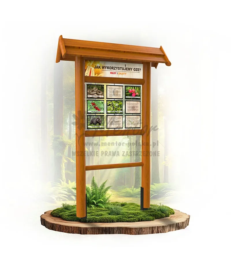 Konstrukcja o wymiarach zewnętrznych około 135x220x40 cm, wykonana z drewna iglastego, oparta na słupach nośnych średnicy około 12-14 cm, w których zamontowano na wpust poprzeczki. Całość zwieńczona dwuspadowym dachem. W konstrukcji zamocowano panel tytułowy oraz 9 obracanych tablic edukacyjnych, o wymiarach około 22x17x2 cm, umocowanych na 3 prętach ze stali nierdzewnej. Dla bezpieczeństwa użytkowników tablice posiadają obłe krawędzie, wykonane z malowanego proszkowo profilu aluminiowego.