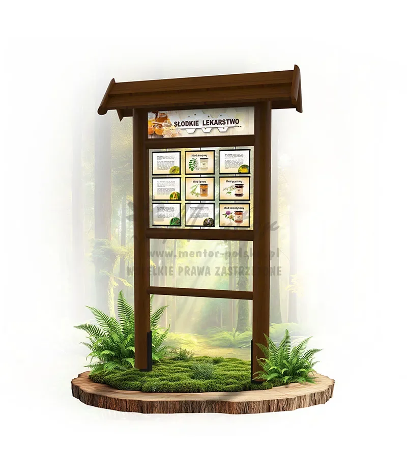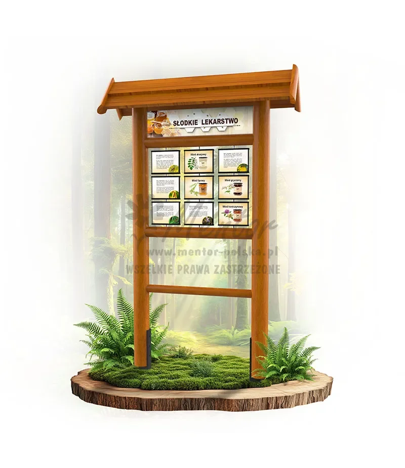 Konstrukcja o wymiarach zewnętrznych około 135x220x40 cm, wykonana z drewna iglastego, oparta na słupach nośnych średnicy około 12-14 cm, w których zamontowano na wpust poprzeczki. Całość zwieńczona dwuspadowym dachem. W konstrukcji zamocowano panel tytułowy oraz 9 obracanych tablic edukacyjnych, o wymiarach około 22x17x2 cm, umocowanych na 3 prętach ze stali nierdzewnej. Dla bezpieczeństwa użytkowników tablice posiadają obłe krawędzie, wykonane z malowanego proszkowo profilu aluminiowego.