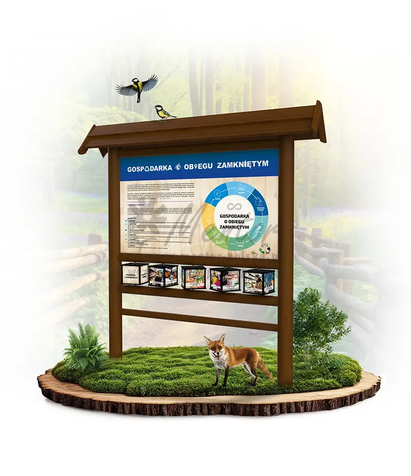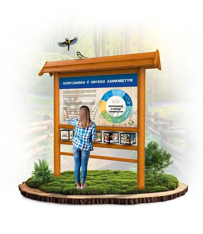 Konstrukcja o wymiarach zewnętrznych około 200x220x40 cm, wykonana z drewna iglastego, oparta na słupach nośnych średnicy około 12-14 cm, w których zamontowano na wpust poprzeczki. Całość zwieńczona dwuspadowym dachem. W konstrukcji zamocowano dwustronnie zadrukowaną tablicę edukacyjną. Awers – solidna dawka wiedzy merytorycznej wraz z profesjonalnymi fotografiami/ilustracjami. Rewers – zadruk wielkoformatowy wysokiej rozdzielczości nawiązujący do tematyki gry. Pod tablicą zamontowano 5 czterostronnych, zadrukowanych elementów w postaci prostopadłościanu (kostki) o wymiarach około 19x19x17 cm obracanych na 5 prętach ze stali nierdzewnej. Dla bezpieczeństwa użytkowników kostki posiadają obłe krawędzie, wykonane z malowanego proszkowo profilu aluminiowego.