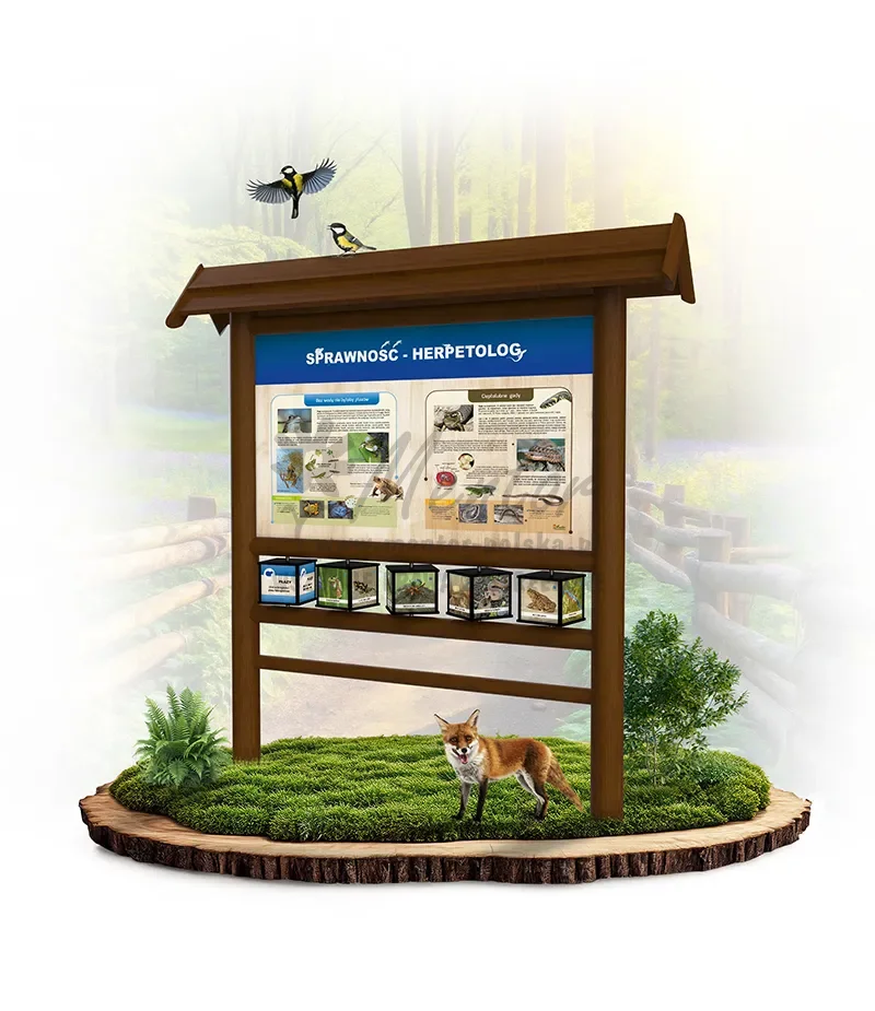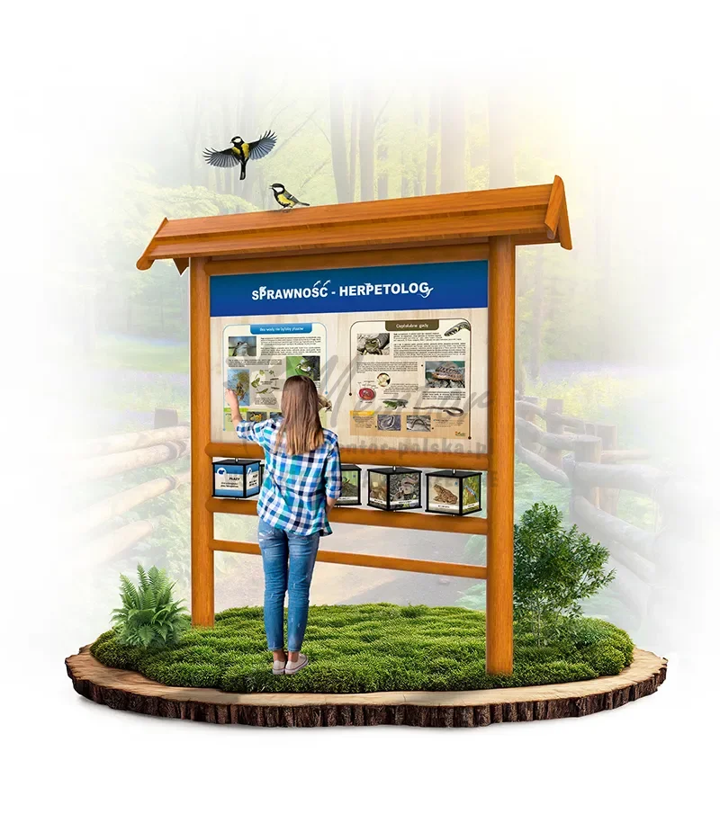 Konstrukcja o wymiarach zewnętrznych około 200x220x40 cm, wykonana z drewna iglastego, oparta na słupach nośnych średnicy około 12-14 cm, w których zamontowano na wpust poprzeczki. Całość zwieńczona dwuspadowym dachem. W konstrukcji zamocowano dwustronnie zadrukowaną tablicę edukacyjną. Awers – solidna dawka wiedzy merytorycznej wraz z profesjonalnymi fotografiami/ilustracjami. Rewers – zadruk wielkoformatowy wysokiej rozdzielczości nawiązujący do tematyki gry. Pod tablicą zamontowano 5 czterostronnych, zadrukowanych elementów w postaci prostopadłościanu (kostki) o wymiarach około 19x19x17 cm obracanych na 5 prętach ze stali nierdzewnej. Dla bezpieczeństwa użytkowników kostki posiadają obłe krawędzie, wykonane z malowanego proszkowo profilu aluminiowego.