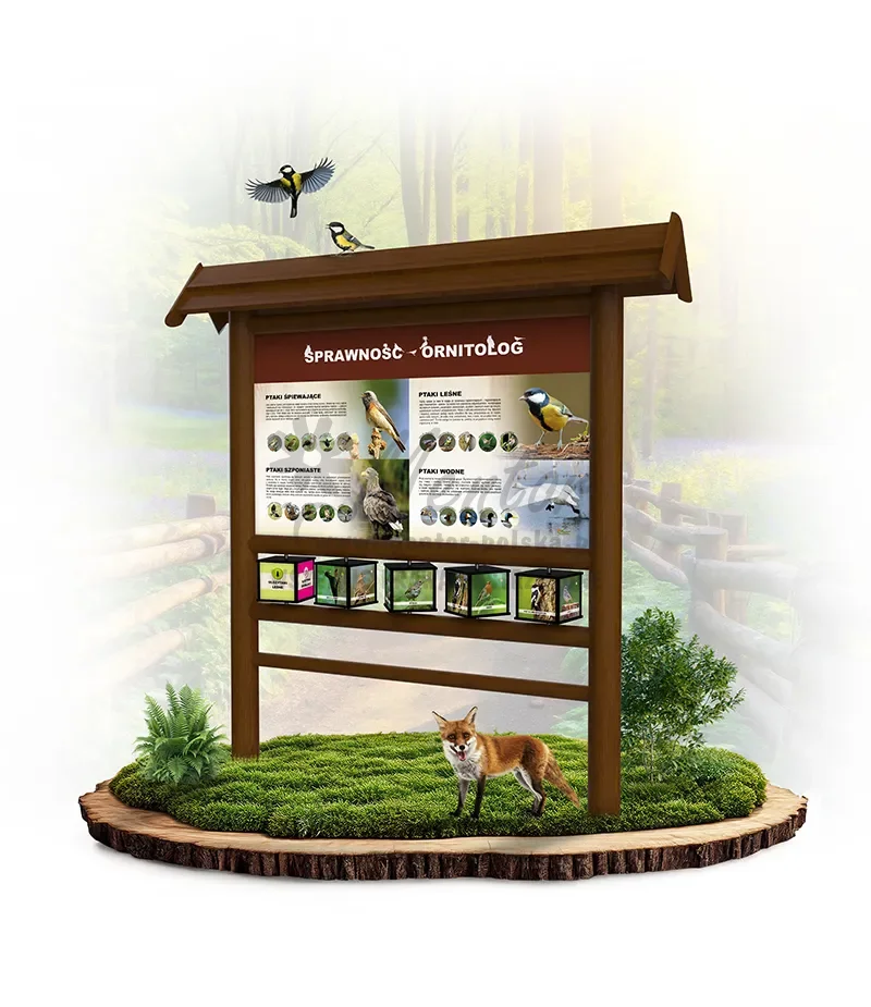 Konstrukcja o wymiarach zewnętrznych około 200x220x40 cm, wykonana z drewna iglastego, oparta na słupach nośnych średnicy około 12-14 cm, w których zamontowano na wpust poprzeczki. Całość zwieńczona dwuspadowym dachem. W konstrukcji zamocowano dwustronnie zadrukowaną tablicę edukacyjną. Awers – solidna dawka wiedzy merytorycznej wraz z profesjonalnymi fotografiami/ilustracjami. Rewers – zadruk wielkoformatowy wysokiej rozdzielczości nawiązujący do tematyki gry. Pod tablicą zamontowano 5 czterostronnych, zadrukowanych elementów w postaci prostopadłościanu (kostki) o wymiarach około 19x19x17 cm obracanych na 5 prętach ze stali nierdzewnej. Dla bezpieczeństwa użytkowników kostki posiadają obłe krawędzie, wykonane z malowanego proszkowo profilu aluminiowego.