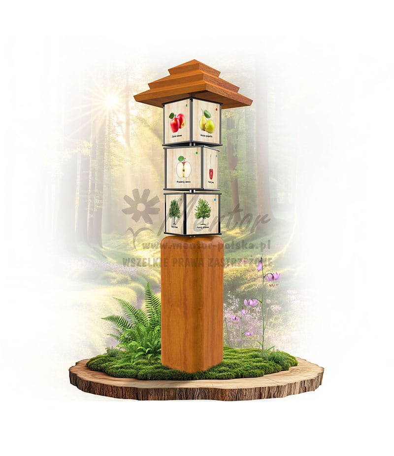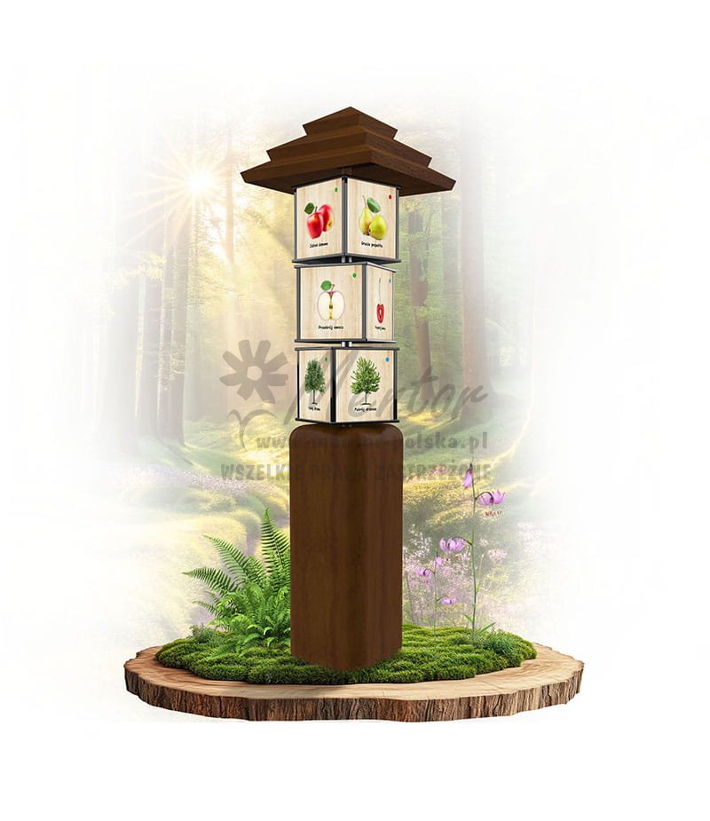 Konstrukcja o wymiarach zewnętrznych około 50x180x50 cm, wykonana z drewna iglastego o przekroju kwadratowym. Konstrukcja zwieńczona czterostronnym dachem. Nad podstawą obsadzono 3 czterostronne, zadrukowane elementy w postaci prostopadłościanu (kostki) o wymiarach około 25x25x22 cm, obracane na pręcie ze stali nierdzewnej. Dla bezpieczeństwa użytkowników kostki posiadają obłe krawędzie, wykonane z malowanego proszkowo profilu aluminiowego.