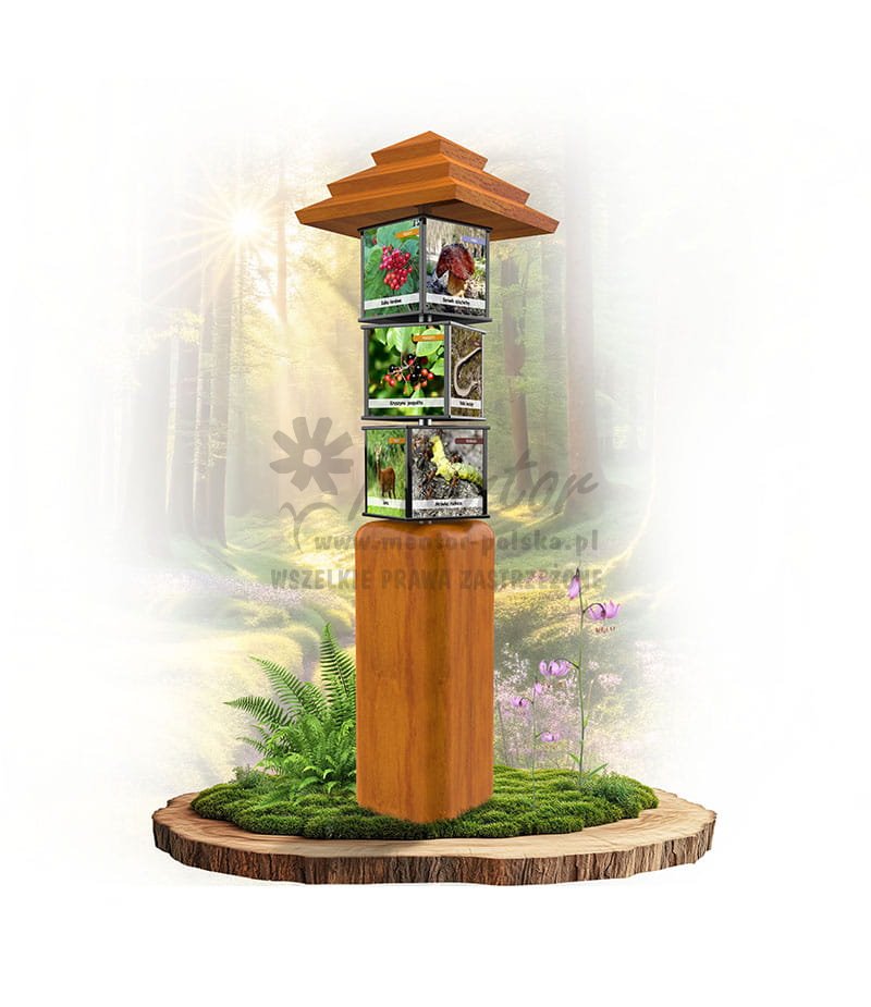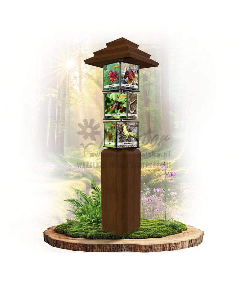 Konstrukcja o wymiarach zewnętrznych około 50x180x50 cm, wykonana z drewna iglastego o przekroju kwadratowym. Konstrukcja zwieńczona czterostronnym dachem. Nad podstawą obsadzono 3 czterostronne, zadrukowane elementy w postaci prostopadłościanu (kostki) o wymiarach około 25x25x22 cm, obracane na pręcie ze stali nierdzewnej. Dla bezpieczeństwa użytkowników kostki posiadają obłe krawędzie, wykonane z malowanego proszkowo profilu aluminiowego.
