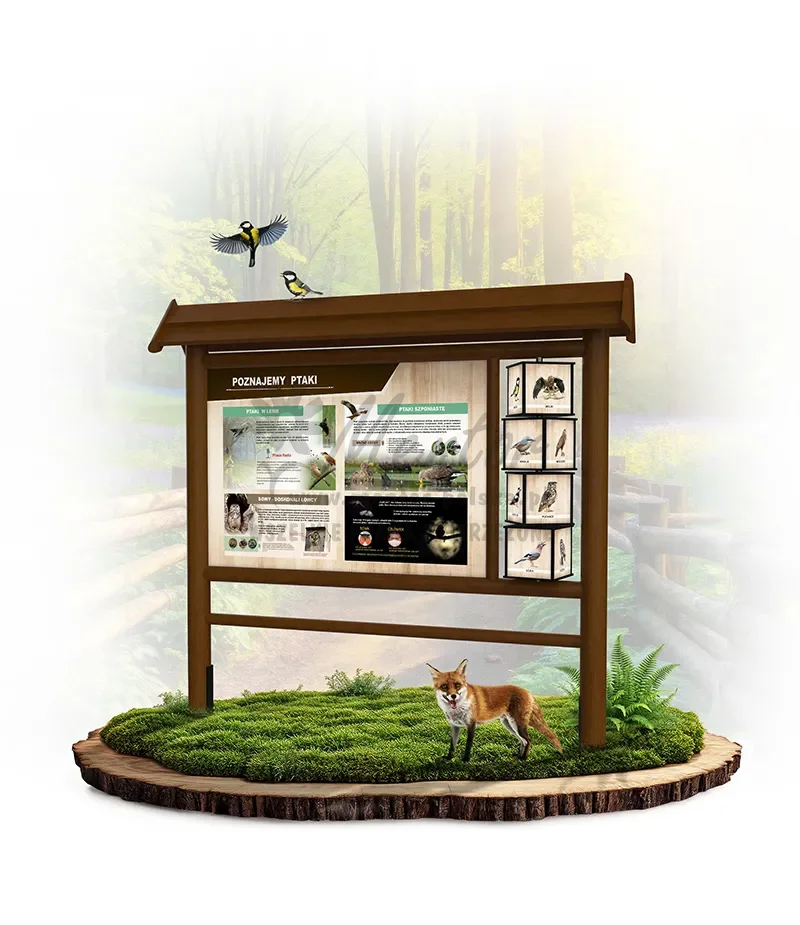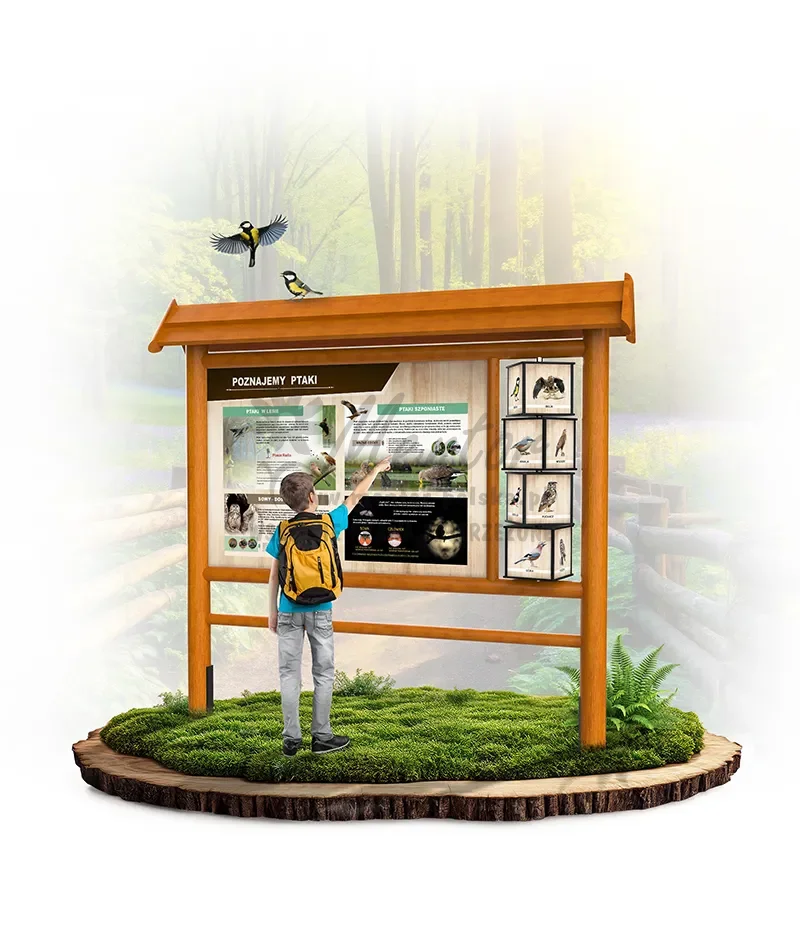 Konstrukcja o wymiarach zewnętrznych około 250x220x40 cm, wykonana z drewna iglastego, oparta na słupach nośnych średnicy około 12-14 cm, w których zamontowano na wpust poprzeczki. Całość zwieńczona dwuspadowym dachem. W konstrukcji zamocowano dwustronnie zadrukowany panel edukacyjny. Po prawej stronie od panelu, zamontowano 4 czterostronne, zadrukowane elementy w postaci prostopadłościanów (kostek) o wymiarach około 25x25x22,5 cm, obracanych na 1 pręcie ze stali nierdzewnej. Dla bezpieczeństwa użytkowników kostki posiadają obłe krawędzie, wykonane z malowanego proszkowo profilu aluminiowego.