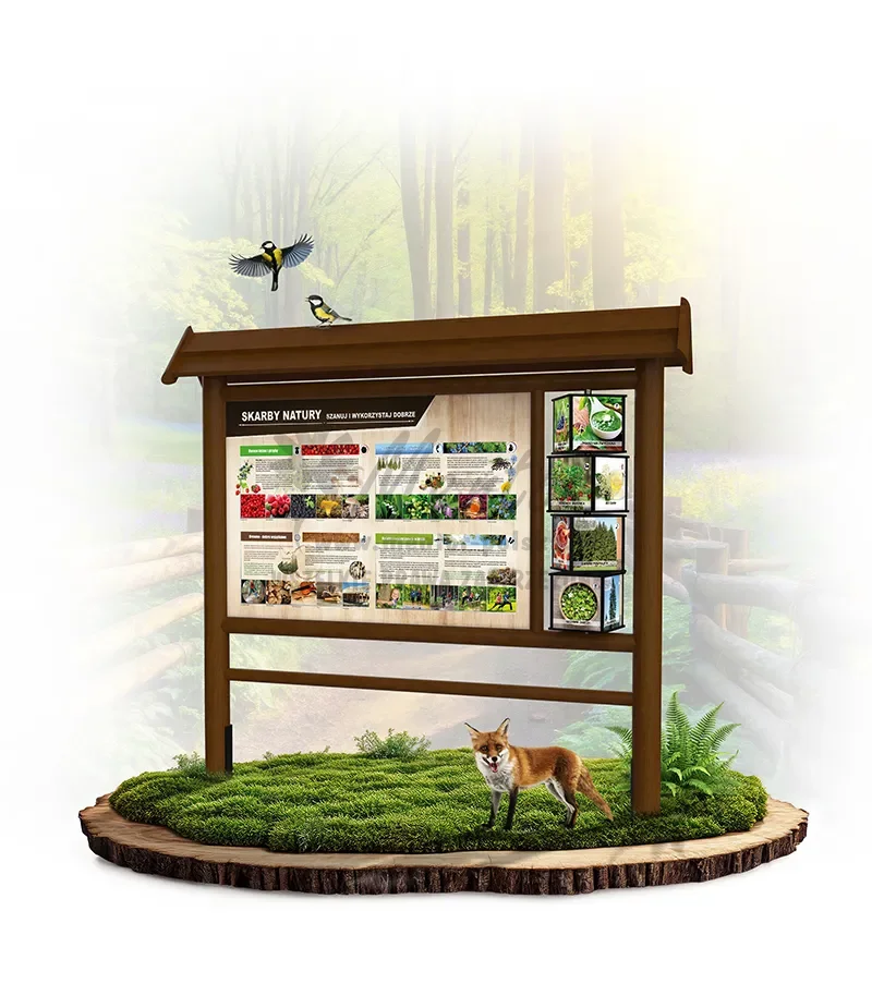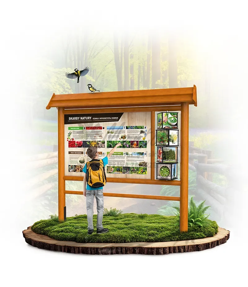 Konstrukcja o wymiarach zewnętrznych około 250x220x40 cm, wykonana z drewna iglastego, oparta na słupach nośnych średnicy około 12-14 cm, w których zamontowano na wpust poprzeczki. Całość zwieńczona dwuspadowym dachem. W konstrukcji zamocowano dwustronnie zadrukowany panel edukacyjny. Po prawej stronie od panelu, zamontowano 4 czterostronne, zadrukowane elementy w postaci prostopadłościanów (kostek) o wymiarach około 25x25x22,5 cm, obracanych na 1 pręcie ze stali nierdzewnej. Dla bezpieczeństwa użytkowników kostki posiadają obłe krawędzie, wykonane z malowanego proszkowo profilu aluminiowego.