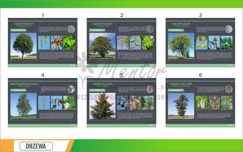 Zestaw zawiera starannie dobrane gatunki drzew, występujących przede wszystkim w lesie. Warto poznać je bliżej, czemu służy prezentacja danego gatunku na pojedynczej tablicy. Informacje przybliżają biologię danego gatunku, jego cechy diagnostyczne: pokrój drzewa, kwiaty, liście/igły, owoce/szyszki, korę celem uwidocznienia istotnych różnic morfologicznych. To wiedza niezbędna nie tylko dla dzieci:-).