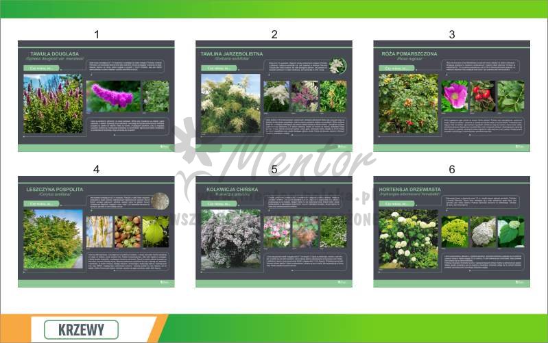 Zestaw zawiera starannie dobrane gatunki krzewów. Warto poznać je bliżej, czemu służy prezentacja danego gatunku na pojedynczej tablicy. Informacje przybliżają biologię danego gatunku, jego cechy diagnostyczne: pokrój krzewu, kwiaty, liście/igły, owoce/szyszki, korę celem uwidocznienia istotnych różnic morfologicznych. To wiedza niezbędna nie tylko dla dzieci:-).