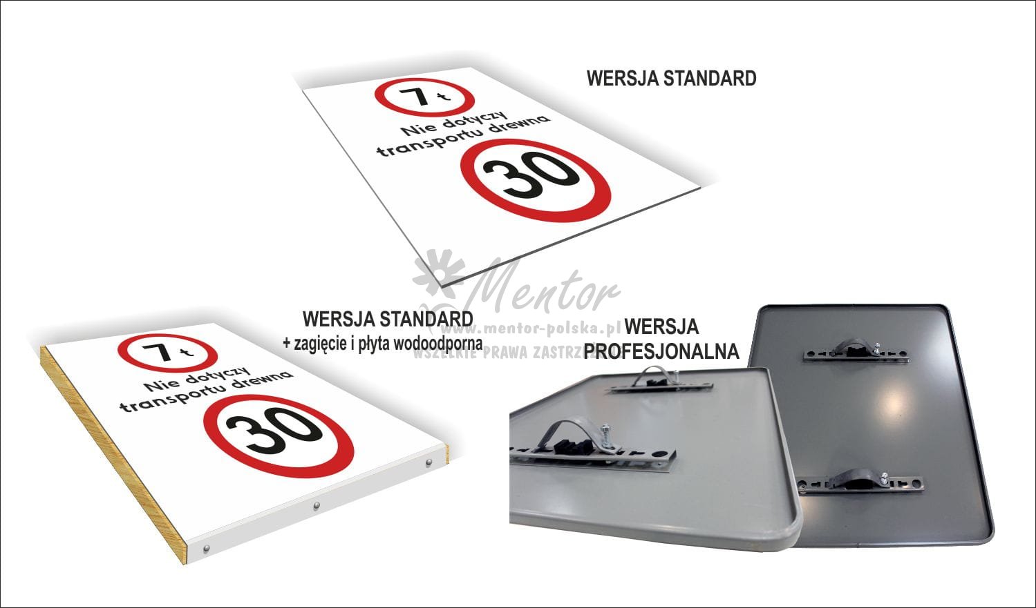 - Wersja standard z zagięciem i płytą wodoodporną - nośnik blacha, grubość ok. 0,55 mm, zalecana do ekspozycji zewnętrznej - nadruk na folii, zabezpieczony laminatem UV, blacha zagięta z góry i z dołu, całość przymocowana do płyty wodoodpornej.