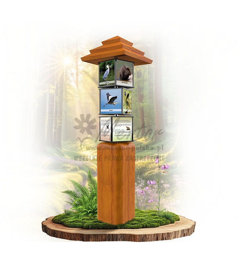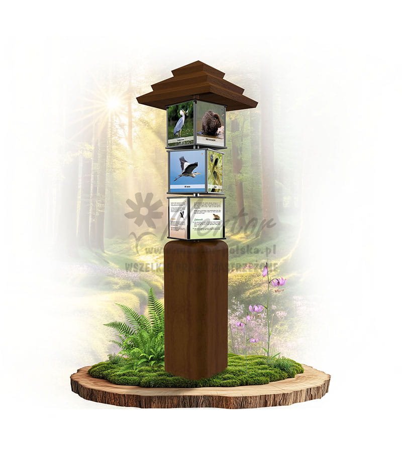 Konstrukcja o wymiarach zewnętrznych około 50x180x50 cm, wykonana z drewna iglastego o przekroju kwadratowym. Konstrukcja zwieńczona czterostronnym dachem. Nad podstawą obsadzono 3 czterostronne, zadrukowane elementy w postaci prostopadłościanu (kostki) o wymiarach około 25x25x22 cm, obracane na pręcie ze stali nierdzewnej. Dla bezpieczeństwa użytkowników kostki posiadają obłe krawędzie, wykonane z malowanego proszkowo profilu aluminiowego.
